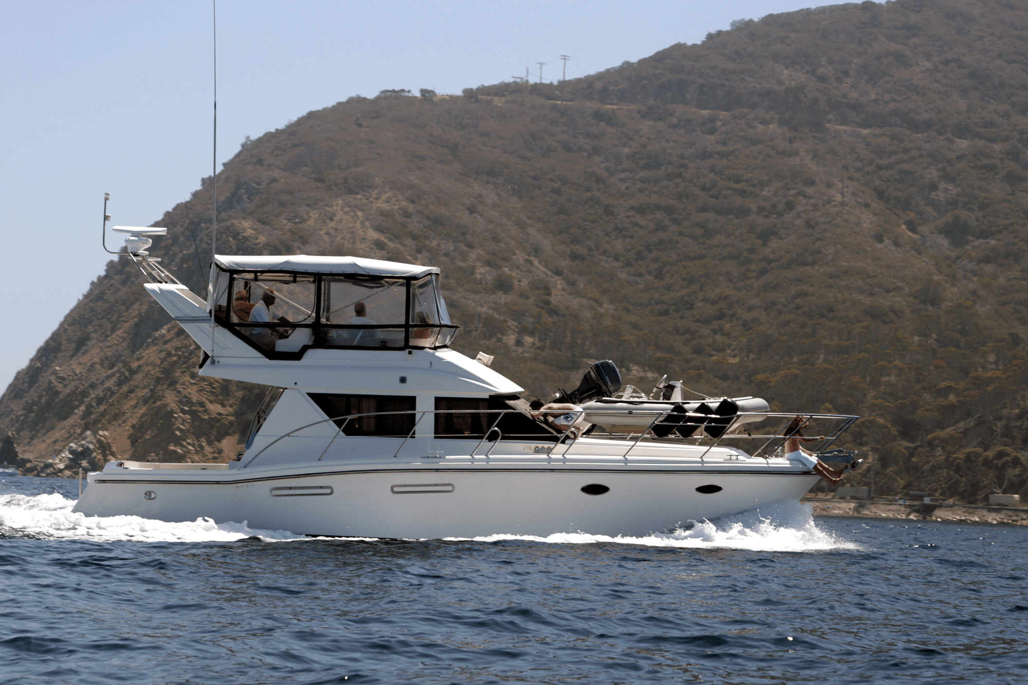 White yacht navigating coastal waters.